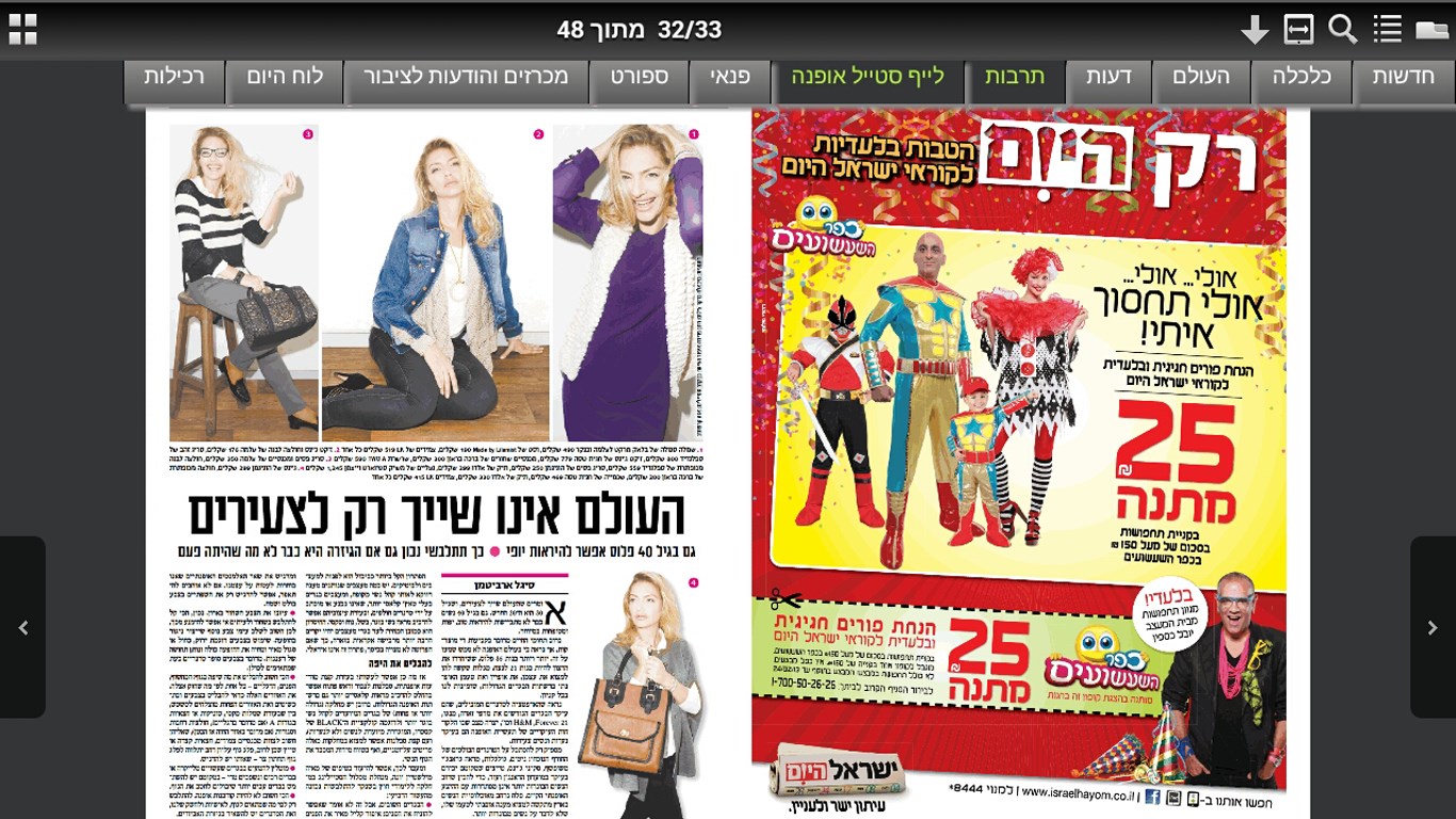 למהדורה מלאה בפורמט דיגיטלי כל הזכויות שמורות לישראל היום עיתון ישראל היום I השלושה 2 תל אביב I 6706056 I ישראל I hayomisraelhayomcoil על מנת להסיר. היא מציגה את כל תכני העיתון בפורמט דיגיטלי חד וברור ובממשק נוח ויעיל לשימוש. ניתן לרכוש מנוי למהדורה המודפסת של ידיעות אחרונות באמצעות מחלקת המנויים של העיתון.